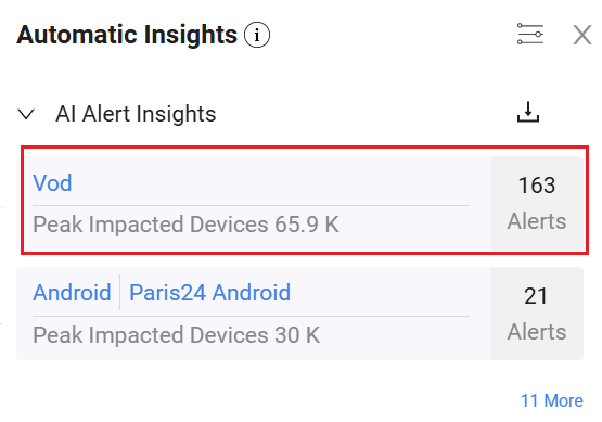 Clicking an insight links to the relevant page for additional diagnostics and information. For example, an alert insight link to the AI Alert page for that alert. Broken Asset insights link to Trends, filtered by that asset. App Version links to the Compare dashboard with metrics for the current and previous versions.