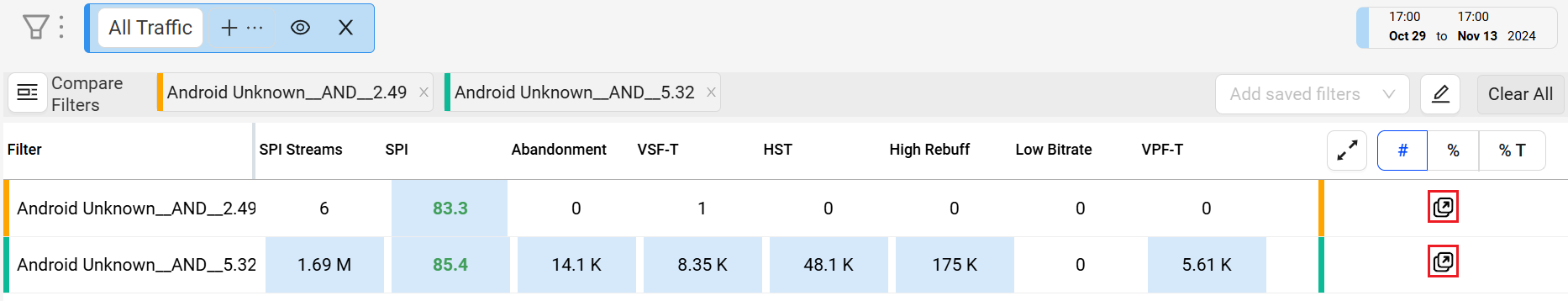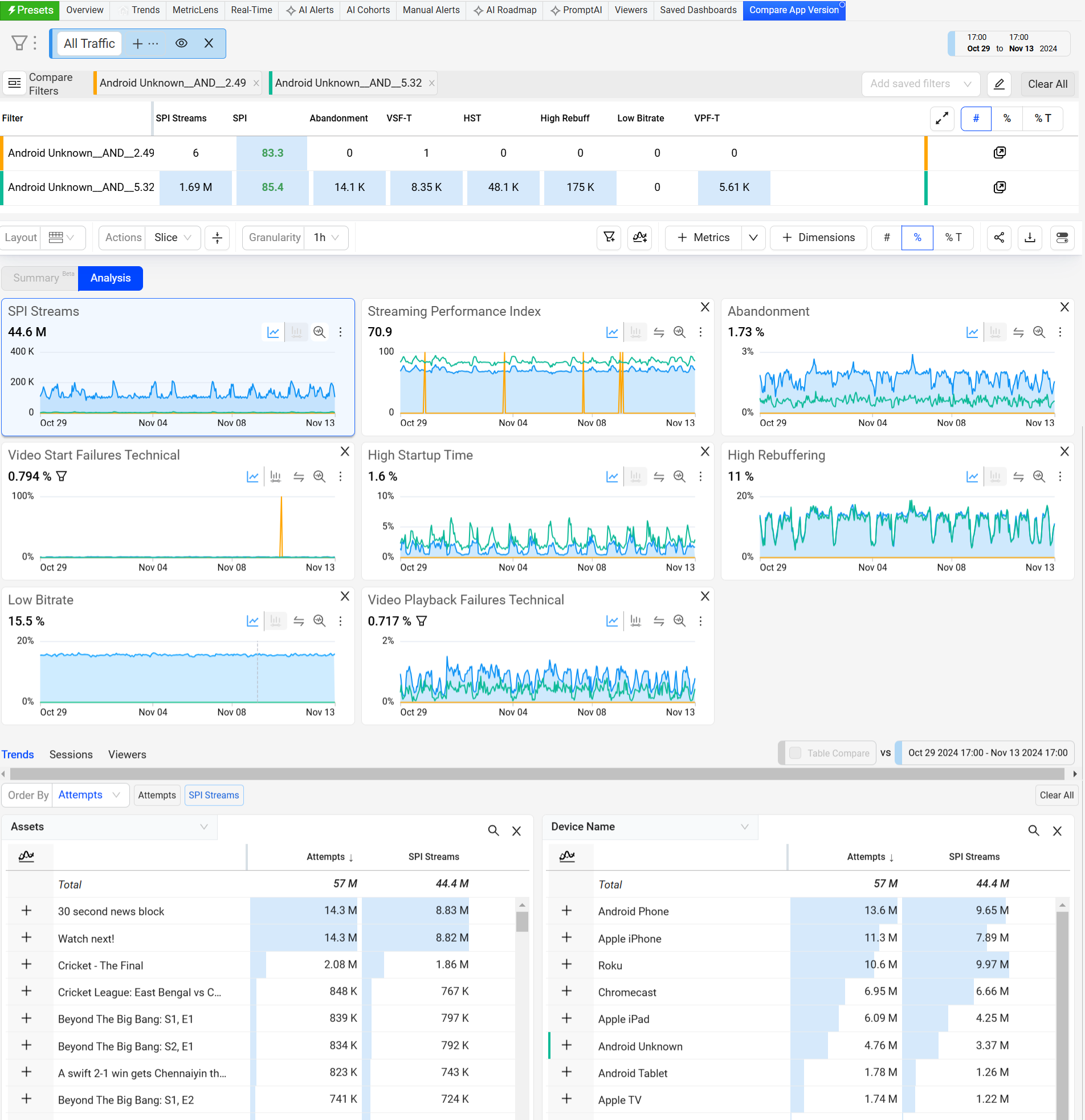 New App Version Performance links to Compare with SPI metrics