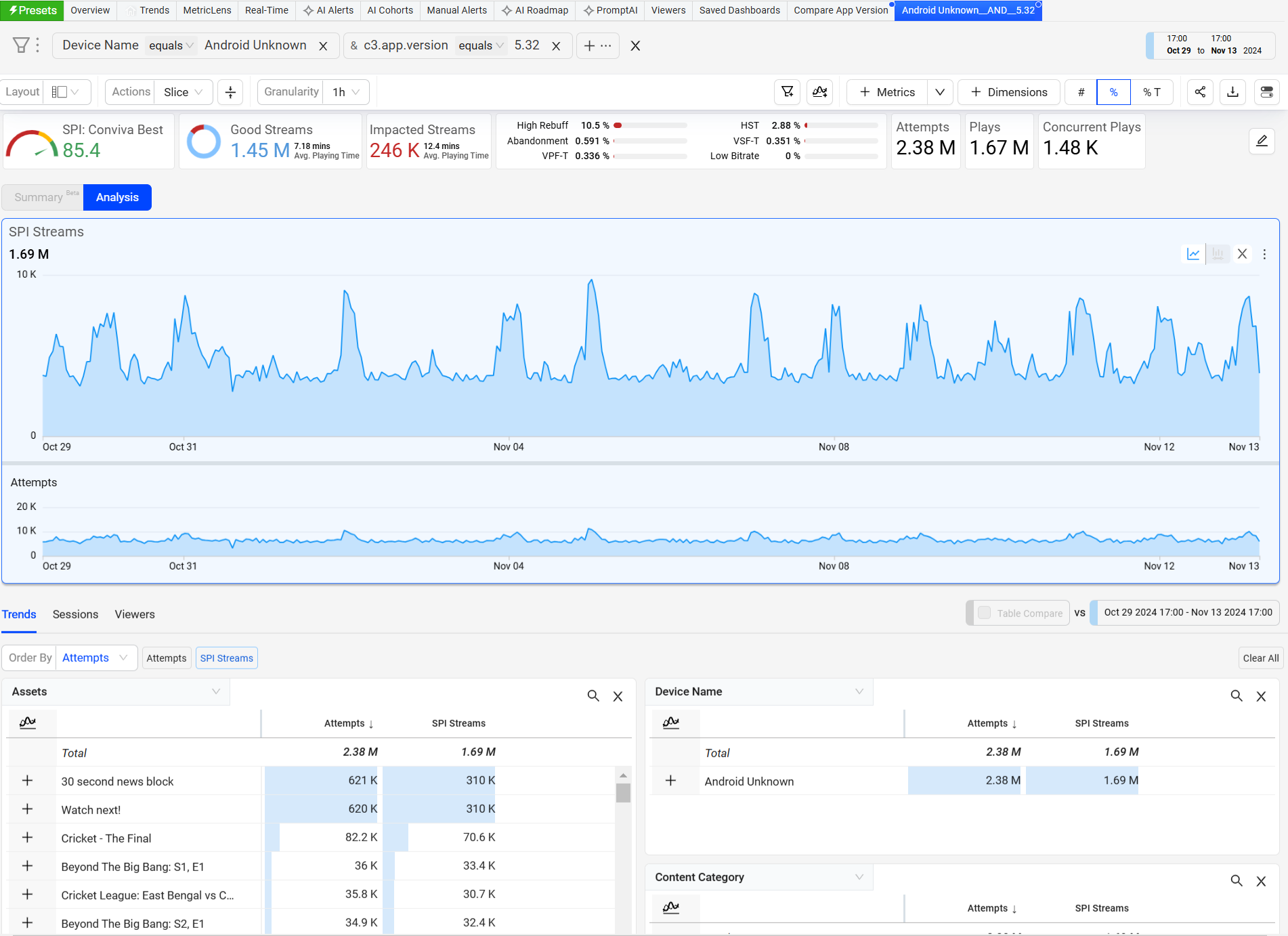 Note: The displayed App Version depends on the dimension passed to Conviva. Unknown appears when a dimension is not available.