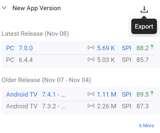 The export button downloads all listed app version(s) in a .csv file.