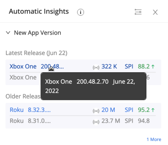 Hover over the New App Version entry to see the release date of the application. The Automatic Insights displays the latest release and older releases for comparison.