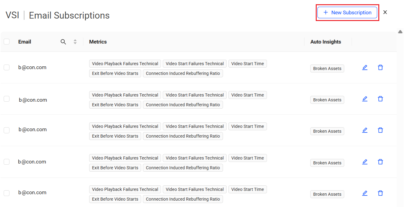 On the Email Subscription screen, click +New Subscription to configure the email subscriptions.