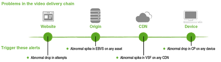 The Conviva alerts feature lets you automate the process of monitoring key quality metrics and emailing team members when alert conditions occur. You might watch for increases in video start failures (VSF, VSF-B, VSF-T metrics) or exits before video start (EBVS metric), both of which indicate viewers are not seeing the content they want. Or, you can notify your programming team when spikes in Concurrent Plays indicate a sudden increase in viewers.