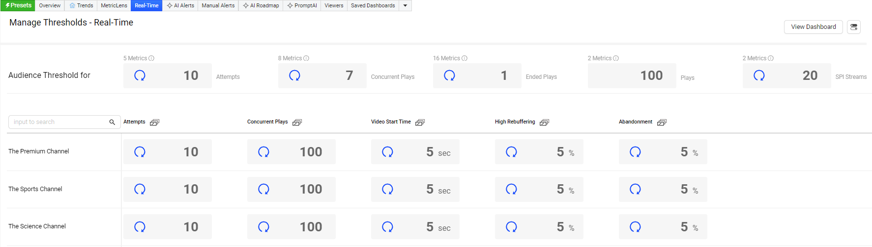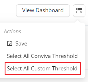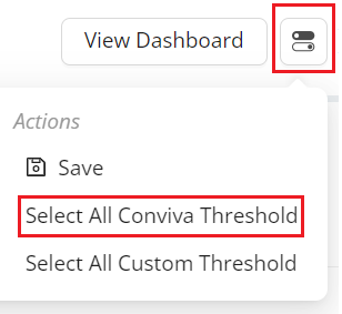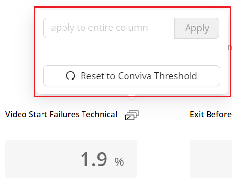Also, Real-Time dashboard provides an option to select the set Conviva threshold values or Custom threshold values for all the displayed assets.