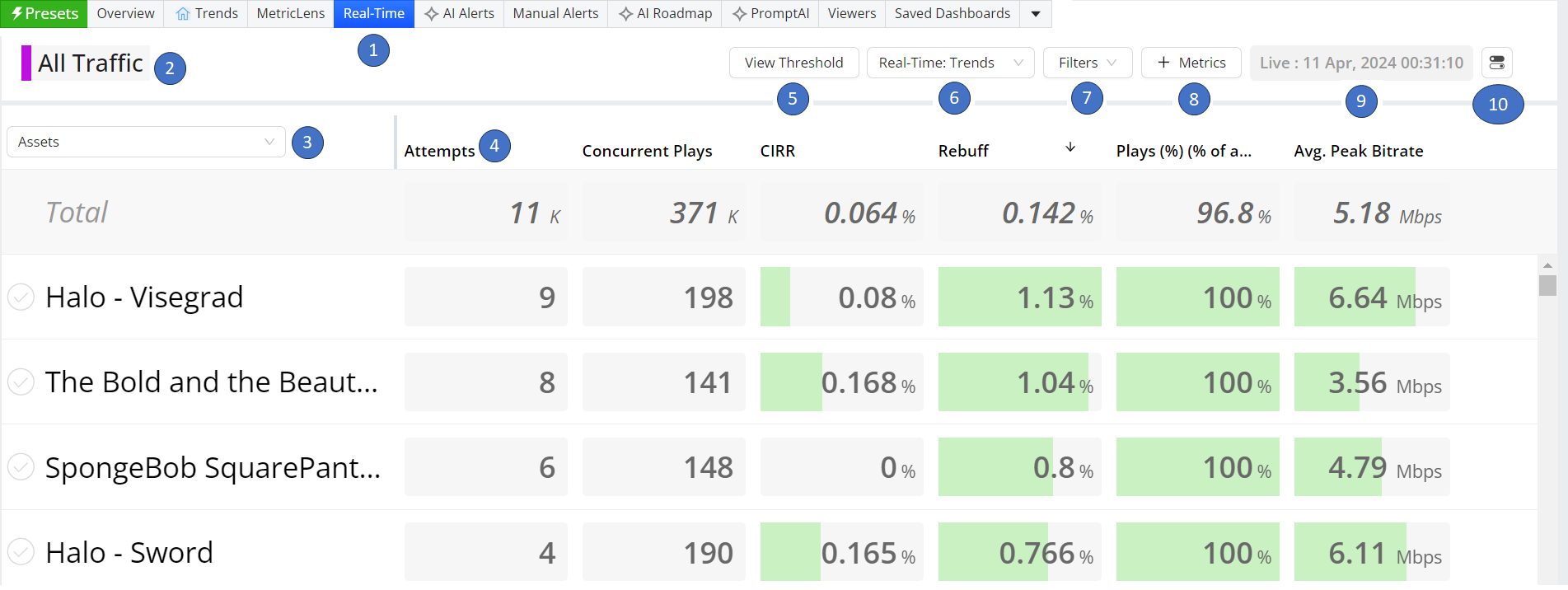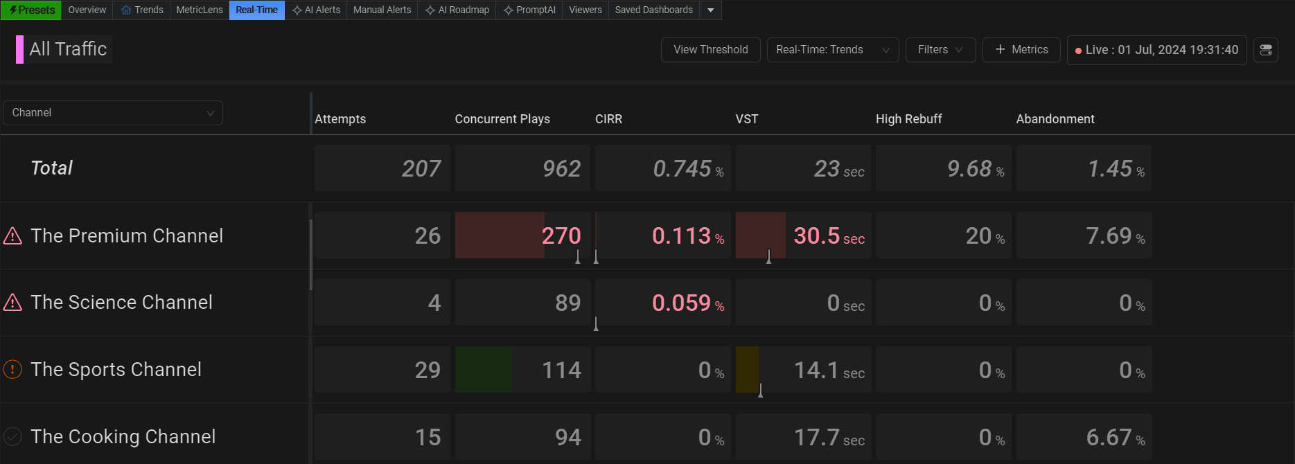 By default, real-time data is auto-sorted by Concurrent Plays and any data with a metric (CIRR) that exceeds a threshold (red highlight) is moved to the top of the data display.