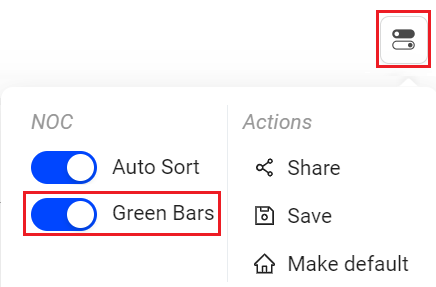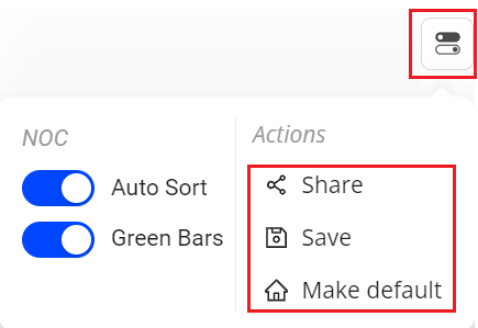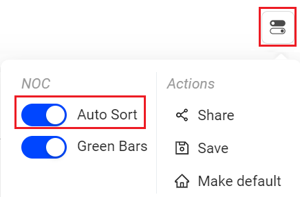 - Kebab icon for threshold settings, light/dark mode toggle, auto sorting toggle, default page setting, share, and save.