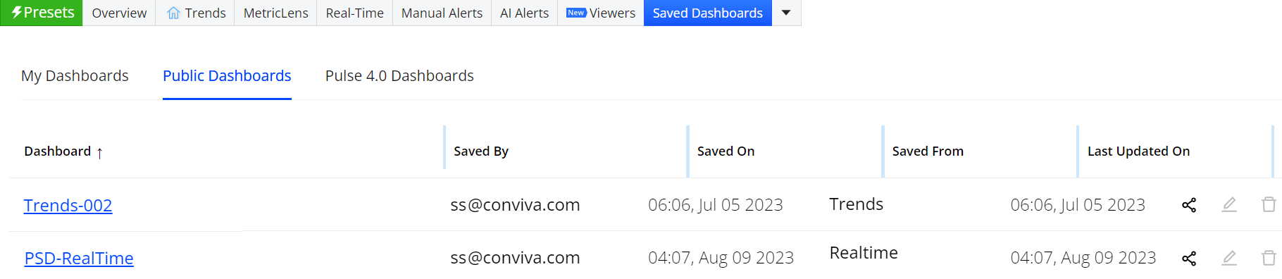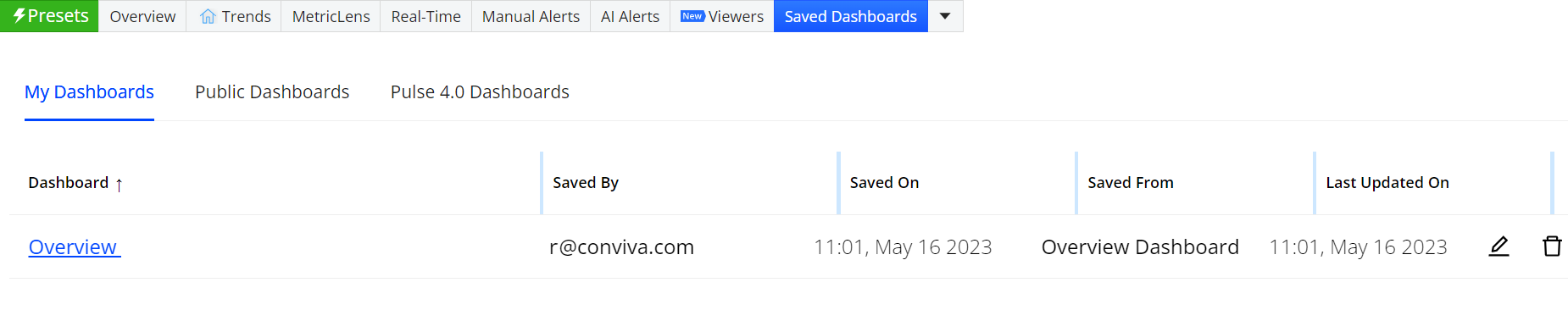 Conviva VSI allows you to save dashboards to preserve the current settings and data for easily access at a later time. The Saved Dashboards displays the privately (My Dashboards) and publicly saved dashboards.