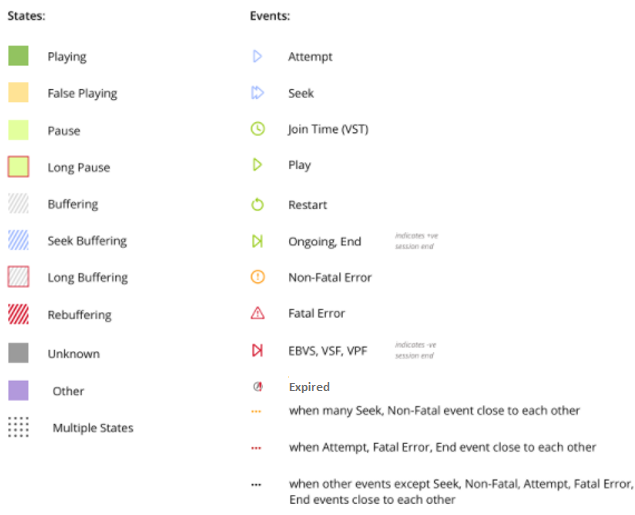 Viewer Timelines enable you to drill-down into session timelines for comprehensive and granular analysis of a session, including session performance details, QoE metric performance, session events, session state changes, and related session metadata. The timelines display the streaming events and player state changes that occur from session start to session end, with the ability to drill-down into second-level streaming behaviors, such as analyzing a session that plays for only several seconds and then fails after experiencing rebuffering, verifying the timing of CDN and bitrate switches throughout the session, or diagnosing rebuffering that repeats throughout a play.