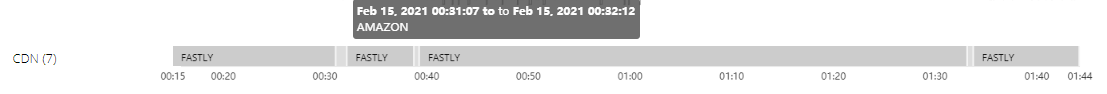 The CDN timeline displays the timeline of CDN use and number of CDN switches in the selected session period along with the duration during which each CDN was used.