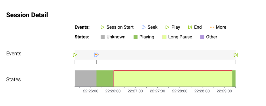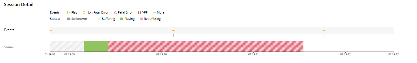 Detailed timelines display events and player states during the period selected in the Session Overview timeline for detailed analysis. For example, this Session Detail timeline illustrates the events and player states in a video stream in which play started successfully, experienced short periods of rebuffering and non-fatal errors, played again and eventually terminated due to a VPF.
