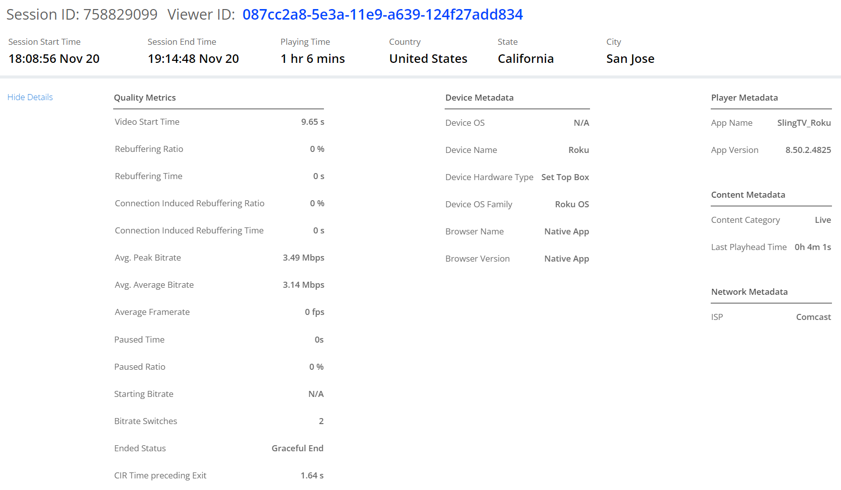 Session data includes quality metrics along with device, player and content metadata. Use the Show Details/Hide Details link to toggle the session data display.
