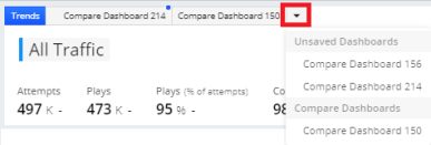 Saved dashboards appear in the tab list and can be accessed from the dashboard drop-down. A blue dot indicates that the dashboard is unsaved.
