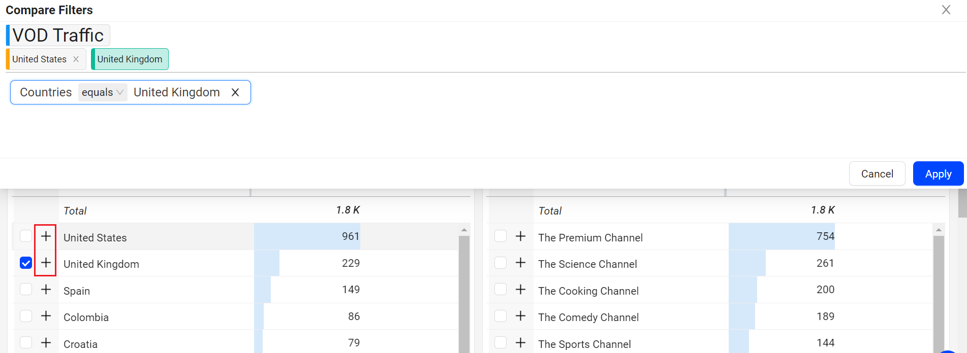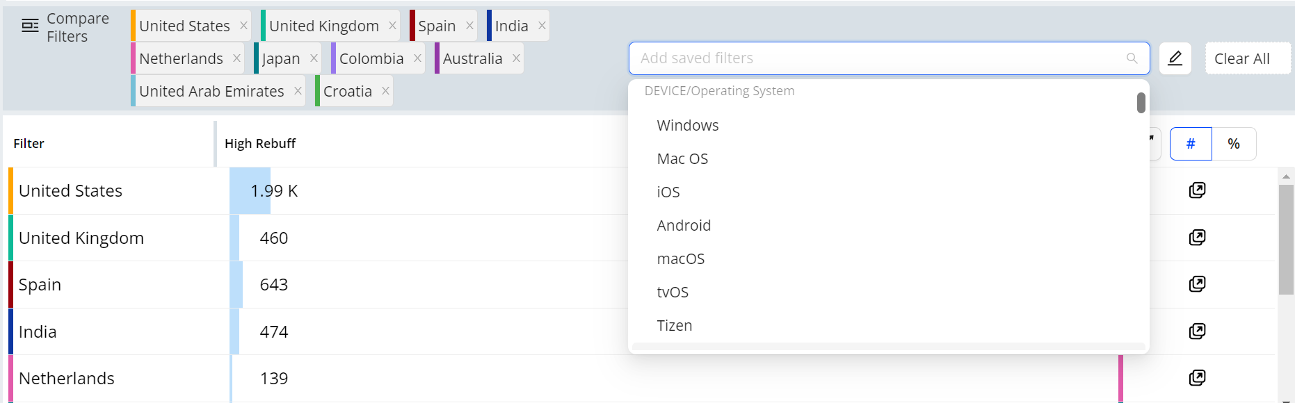 Note: The compare filters can support up to 20 filters. Clicking the Compare Top filters button generates filters for up to the top ten dimensions listed in Trends. You can individually add the remaining filters or include any other ten dimensions by clicking the Compare Top filters button in the corresponding dimension table.