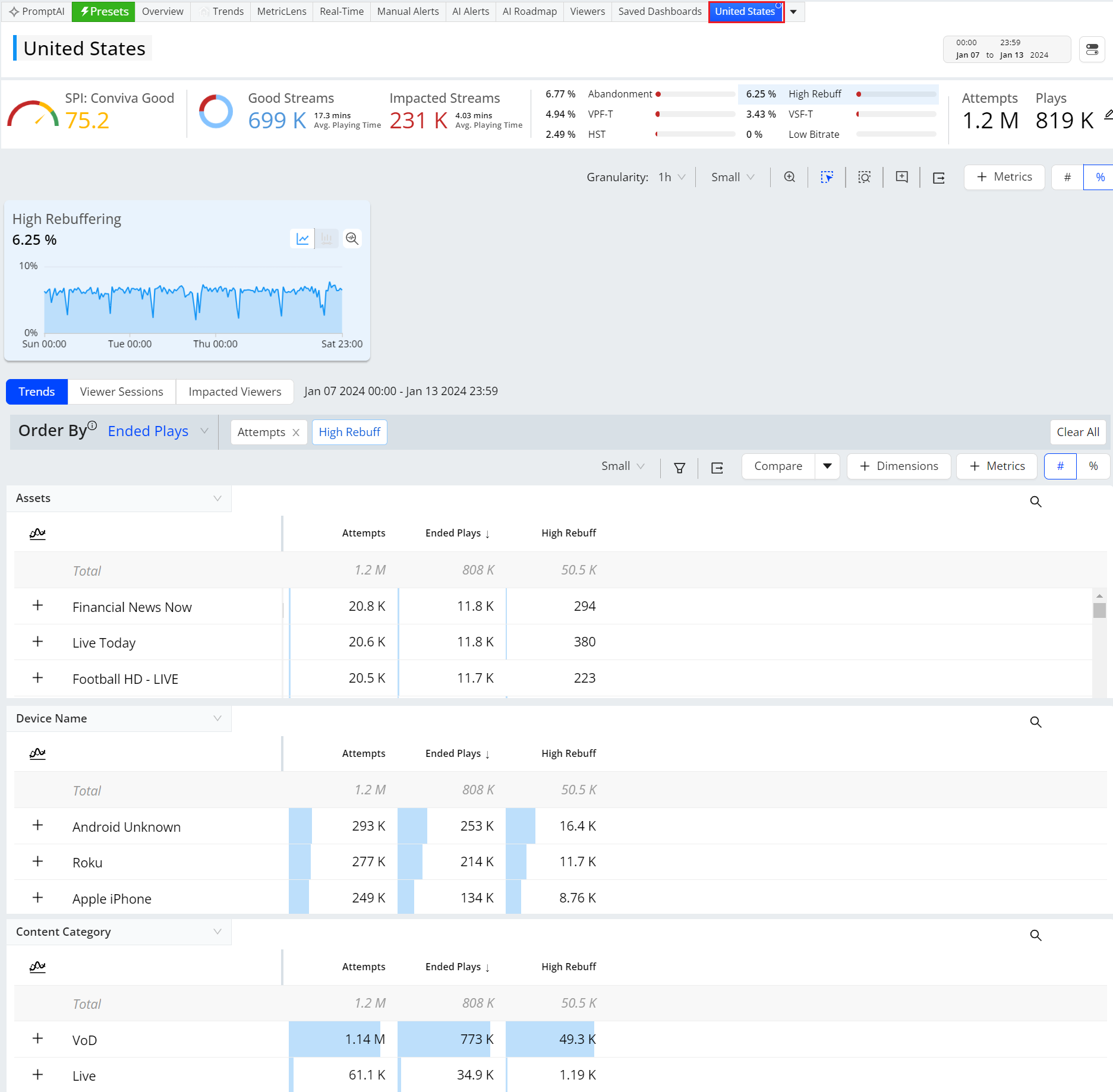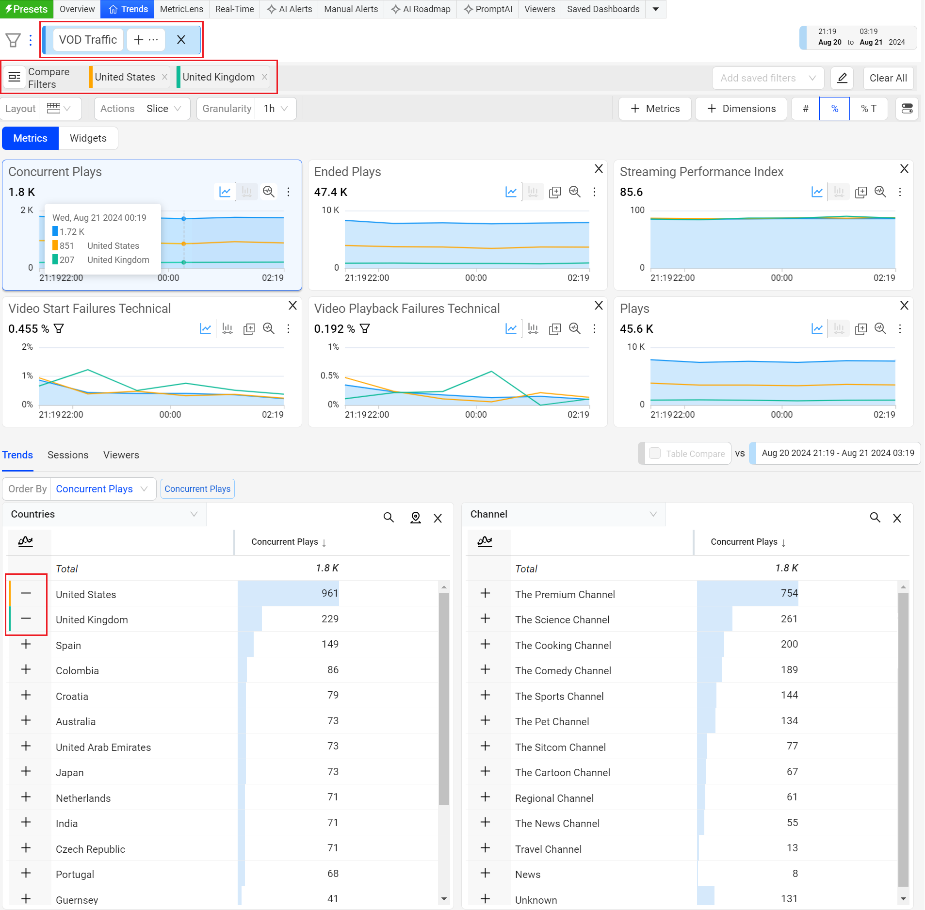 The Trends dashboard provides an instant comparison in addition to the Compare dashboard. Use the Trends dashboard to quickly compare the filters for the top dimension entities or the custom lists of dimension filters.