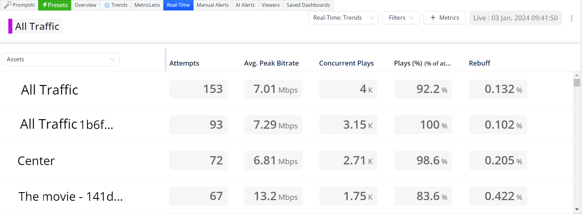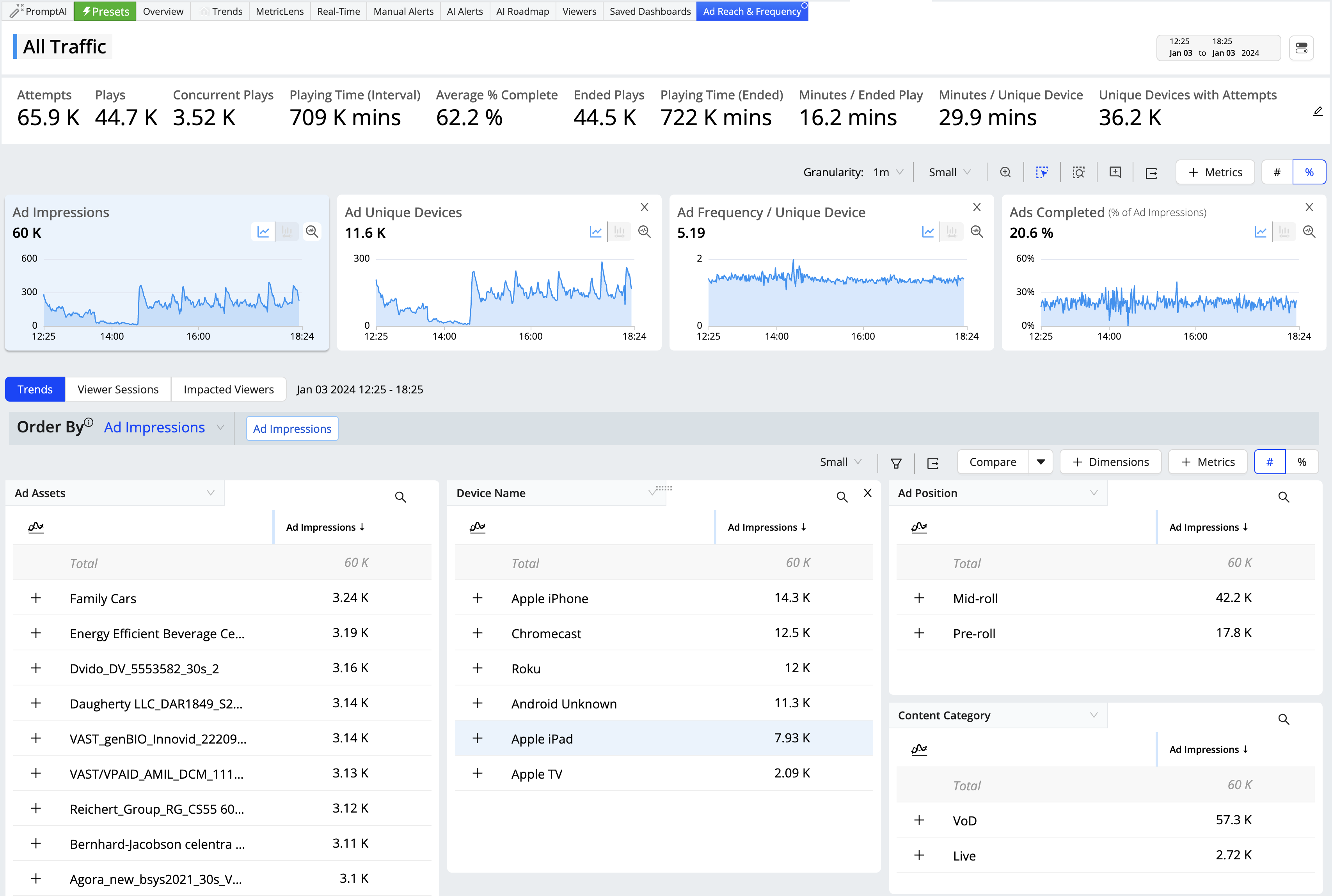 Starting with viewer experience and engagement overviews, quickly monitor performance levels and impacts across your VSI ecosystem: