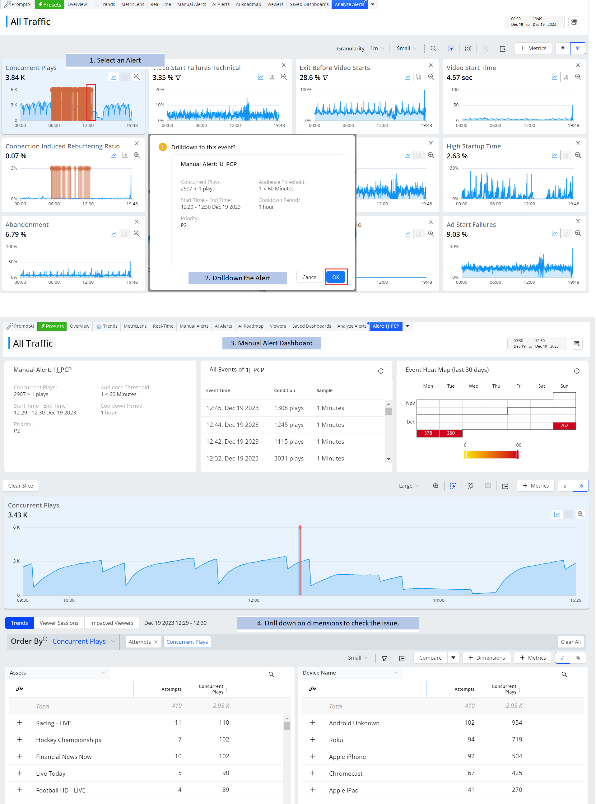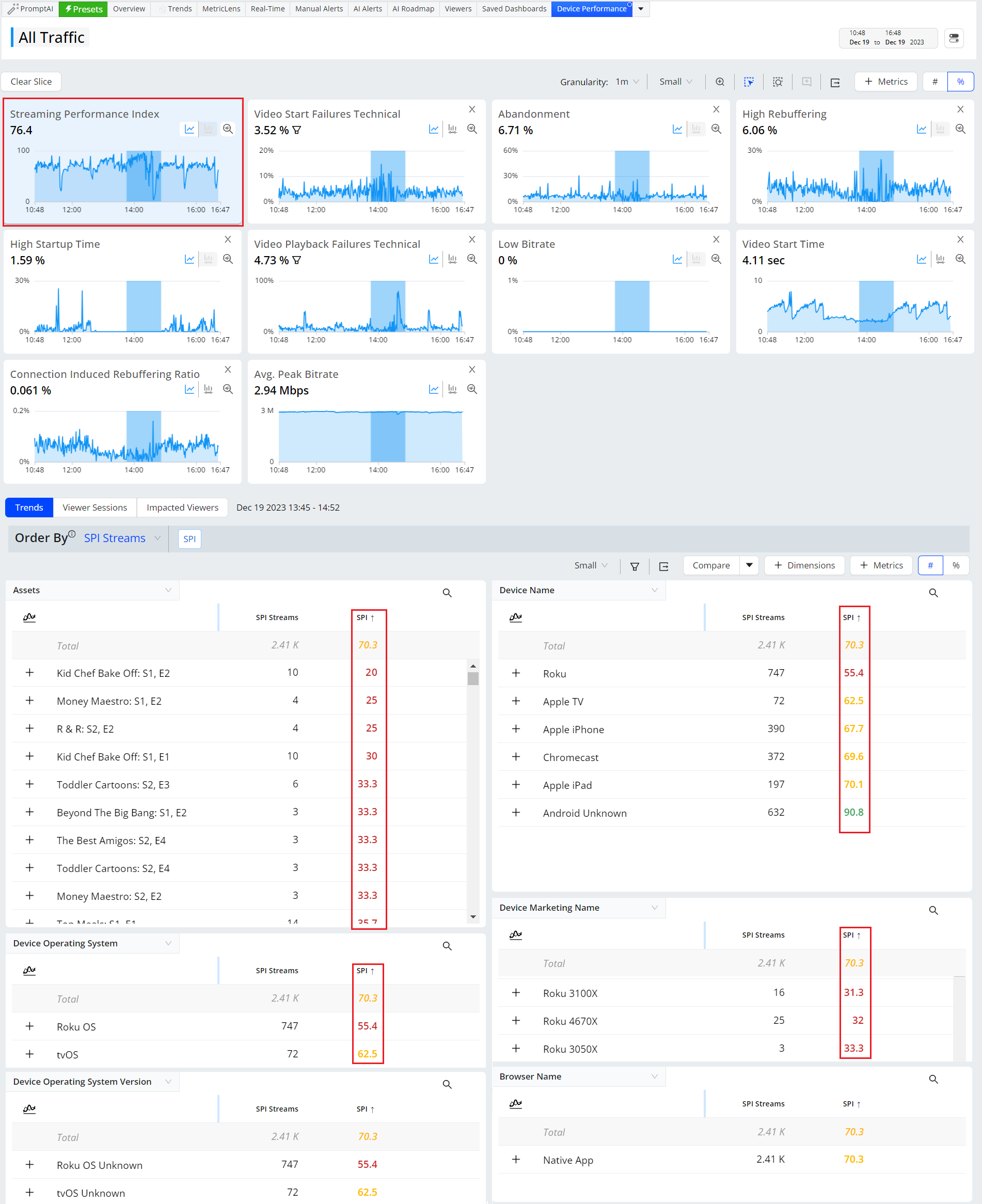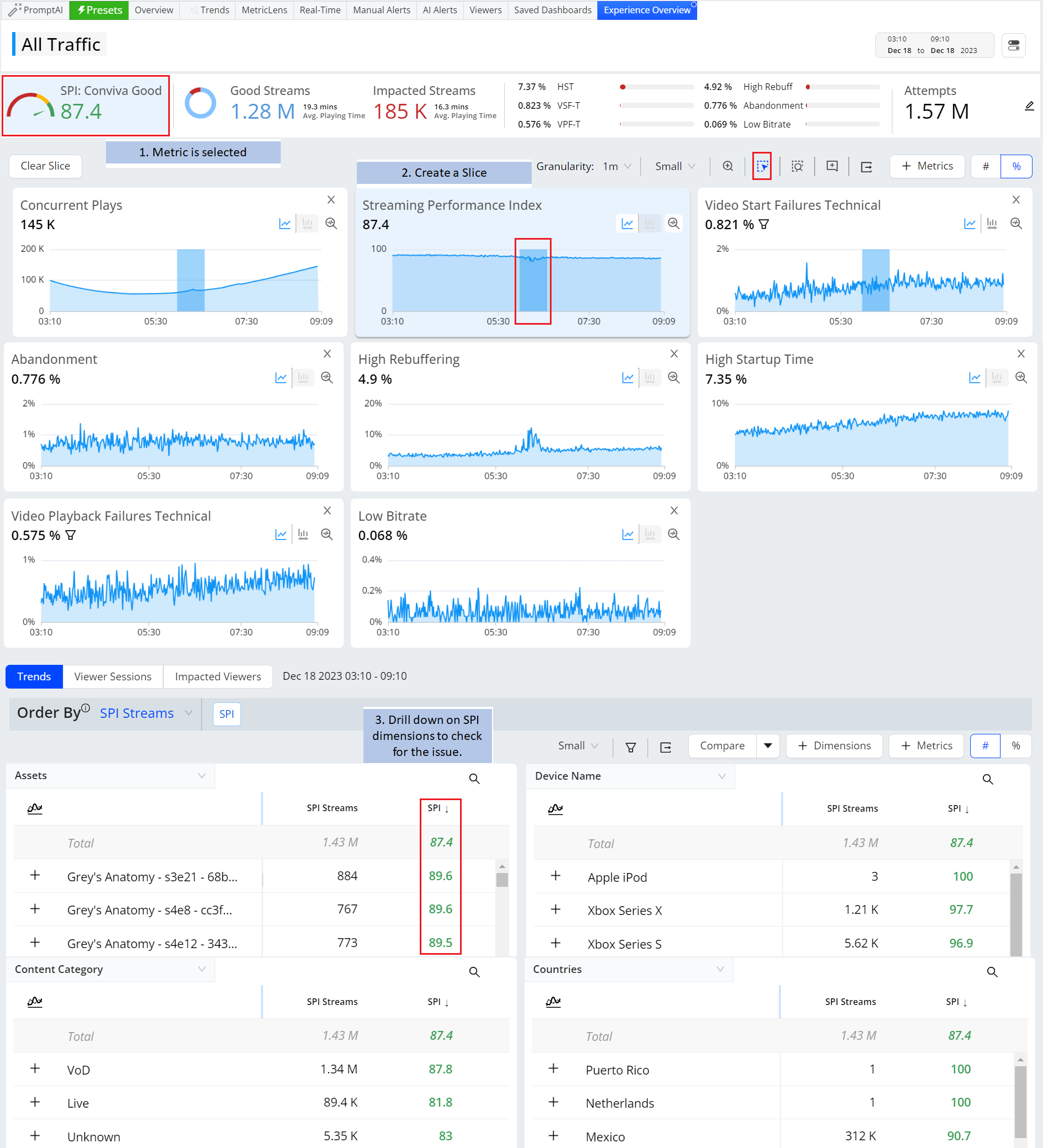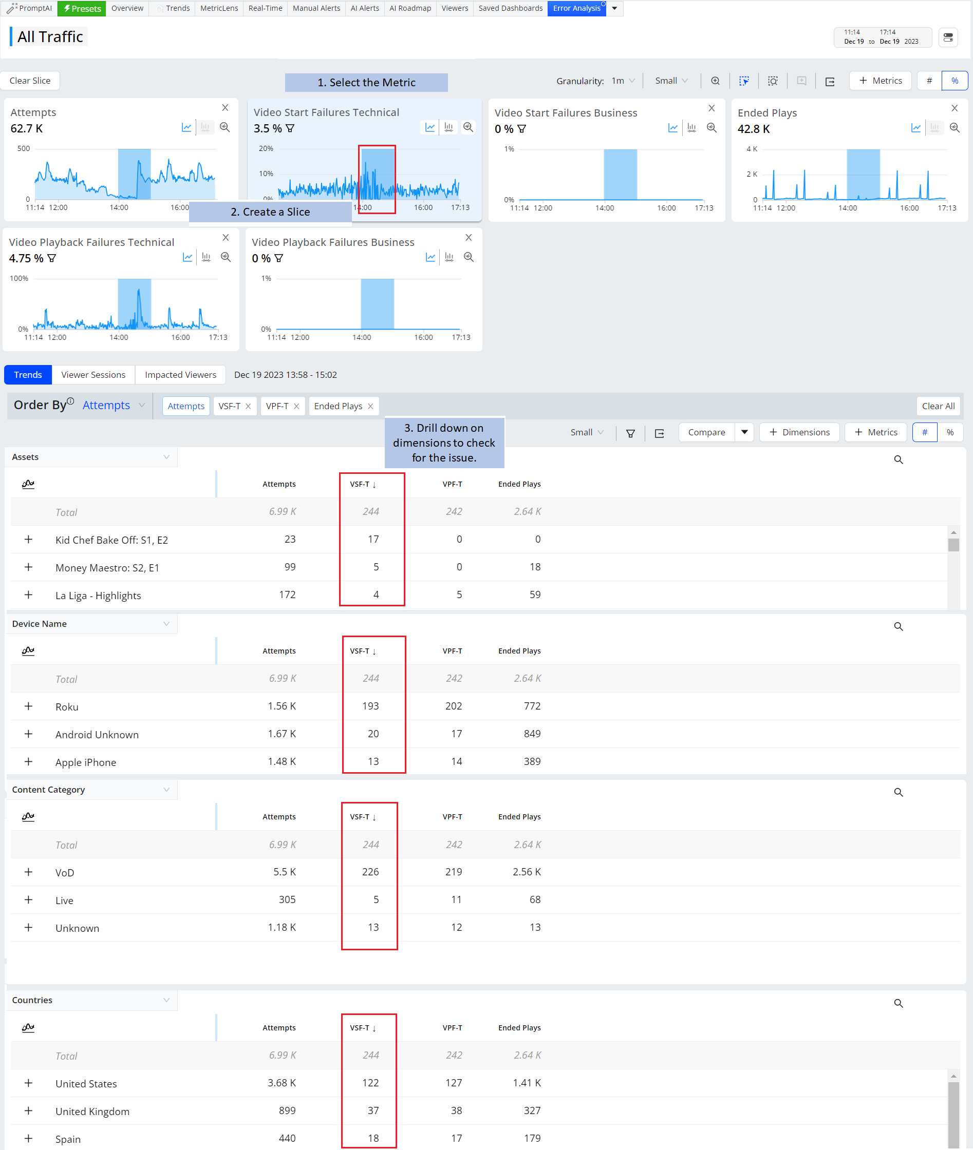 With VSI, TechOps and others can easily perform issue resolutions and continuous improvements, monitoring overall operational performance metrics, drilling-down to discover impacted dimension entities, and analyzing impacted session timelines and viewer experiences. All these diagnostics and operational capabilities are available for historical and real-time data, across customizable levels of granularity (1 minute to 1 month).