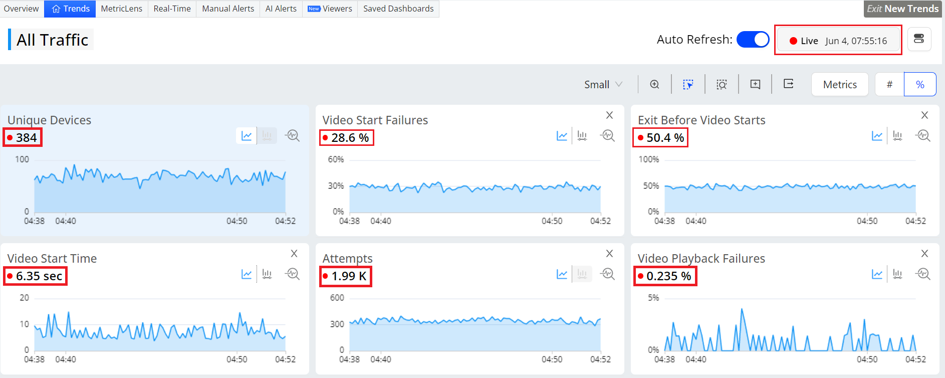 Use MetricLens for dimensional analysis of quality and audience metrics in a unified visual presentation of metric comparison bars and time series with 1-hour granularity. For more details, see MetricLens.