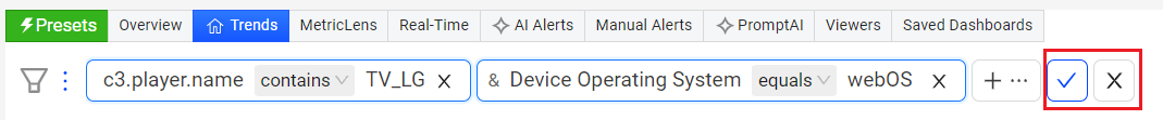 Inline filters in Trends let you add rules in the inline filter bar using saved filters, dimensions, or custom tags. You can modify operators directly and apply the rules inline.