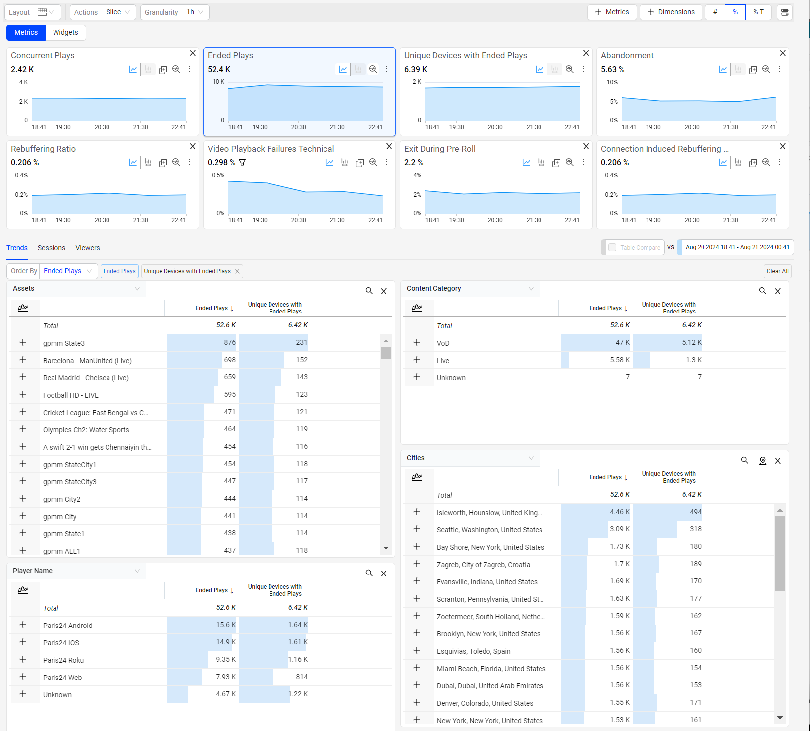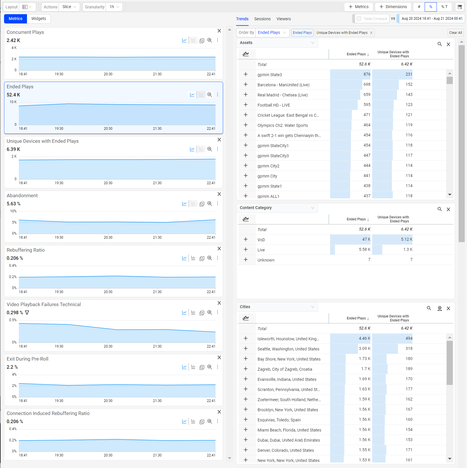 The Trends dashboard offers multiple layout options for metric widget and dimension table positions, allowing customized data display to align data with your analytic preferences.