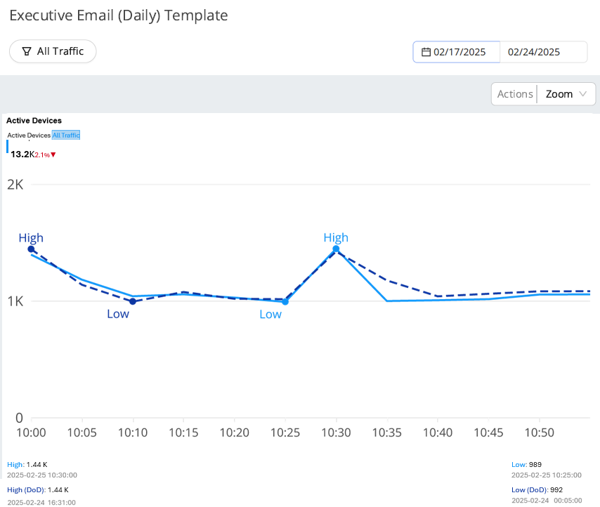 (Optional) Enable DoD: Select the toggle to compare the dimensions and metrics for the selected date and time range. By default, the schedule shows data for the last hour.