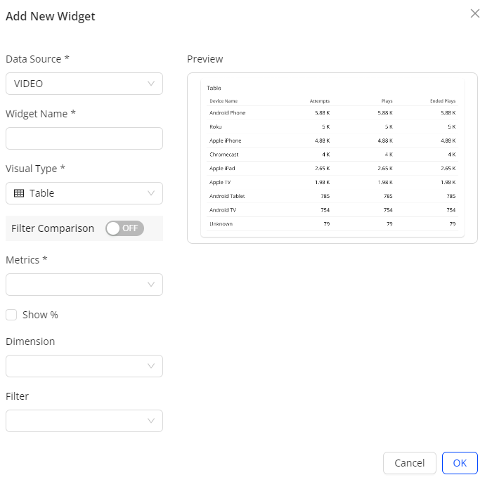 In addition to the predefined percentage metrics, you can select the ‘Show %’ check box for the metrics including Attempts, Ended Plays, Plays, Ad Impressions, and Ad Attempts, to display the metric values as percentages. For these metrics, the percentage is determined by the returned result for each dimension value divided by a total number.