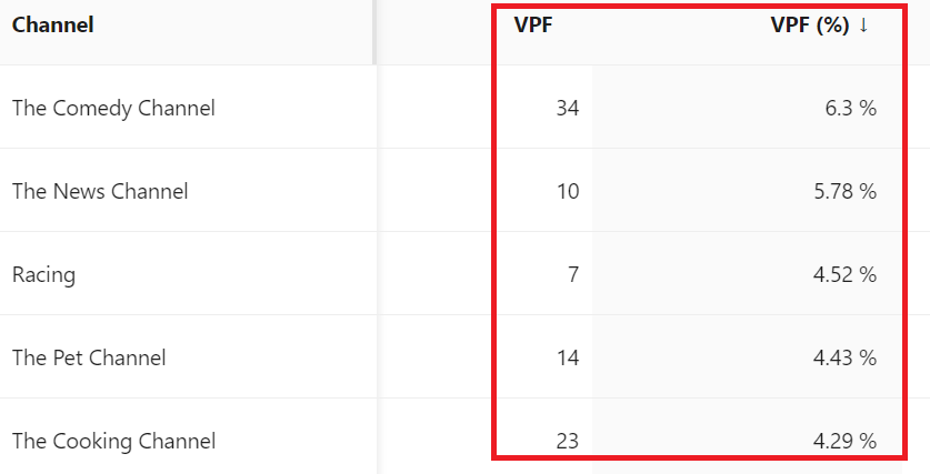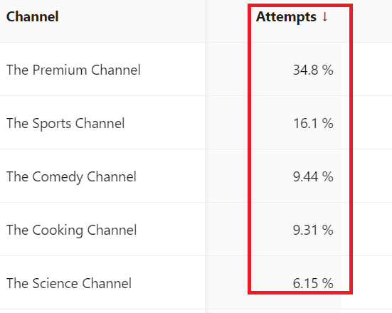 For example, in the above table, the total attempts for The Premium Channel are 5.41K and the total attempts for all channels are 15.5K. After selecting the Show % check box, Custom Dashboards use 5.41K divided by 15.5K to calculate the percentage and show 34.8% as a result.