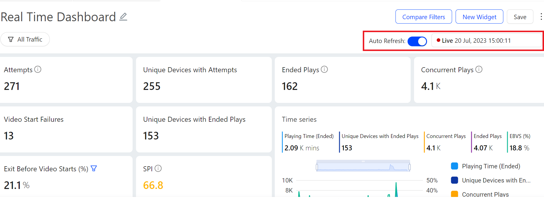 Use the updated date picker to select the live mode. The Live mode shows the time series along with the aggregated metric numbers and percentages on the metric widget aligning the aggregate values with the metric values in the dimension table.