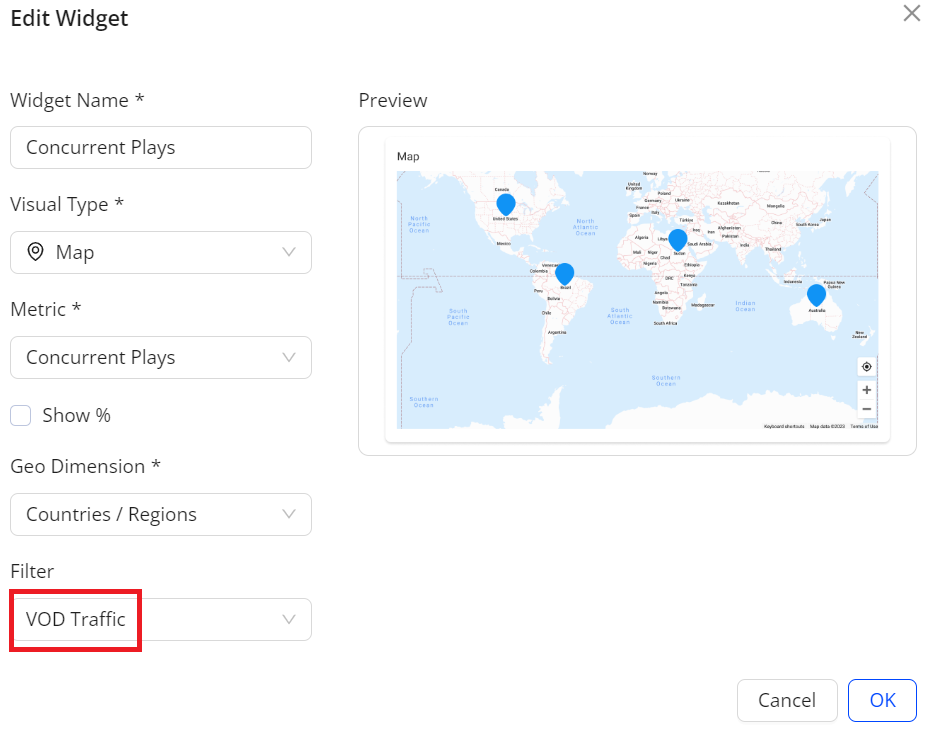 When creating a widget with a map chart, you can also apply a filter to refine the displayed data in the map. For example, use VOD Traffic as a filter to focus on the metric values related to the VOD traffic.