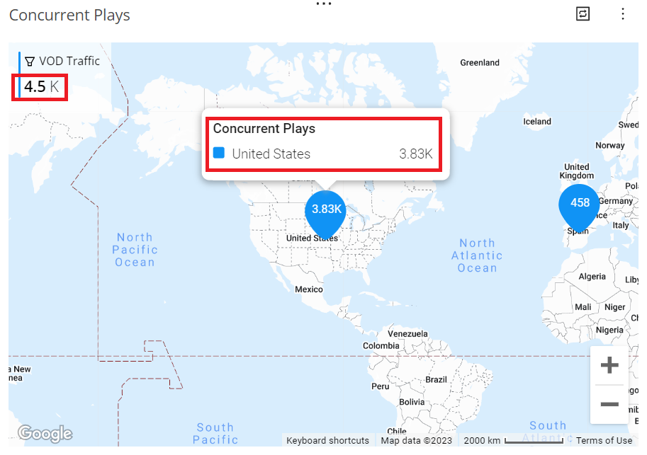 This image shows that the total concurrent plays for the VOD traffic are 4.5 K. Hovering over a country, such as United States, reveals the country name and metric values.
