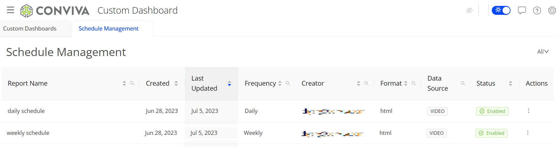 On the Custom Dashboard page, select the “Schedule Management” tab to manage all schedules.