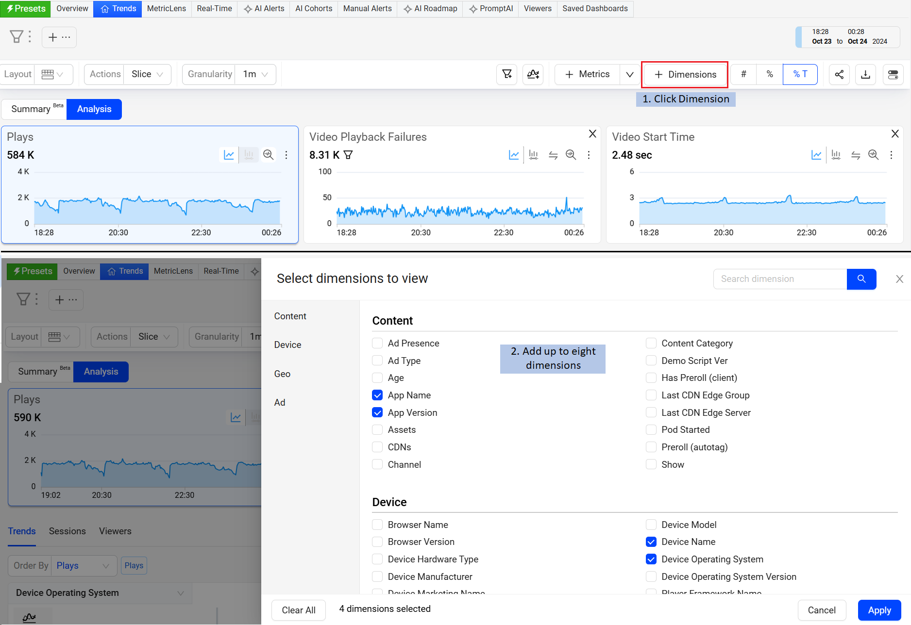 Dimensional Drill-Downs Across Metrics, Impacted Sessions, and Impacted Viewers