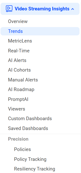 The Trends page exemplifies the ease-of-access to high-level insights for your video streams. You can quickly deep-dive into significant QoE trends and anomalies with quick navigation to advanced features like multidimensional comparisons, impacted session timelines, impacted viewers, and error code analysis.
