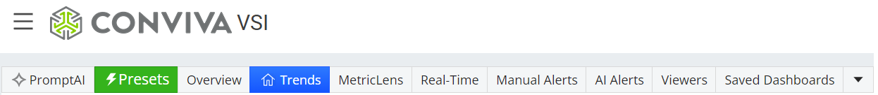 Application Tabs: PromptAI, Presets, Overview, Trends, MetricLens, Real-Time, Manual Alerts, AI Alerts, Viewers, Saved Dashboards