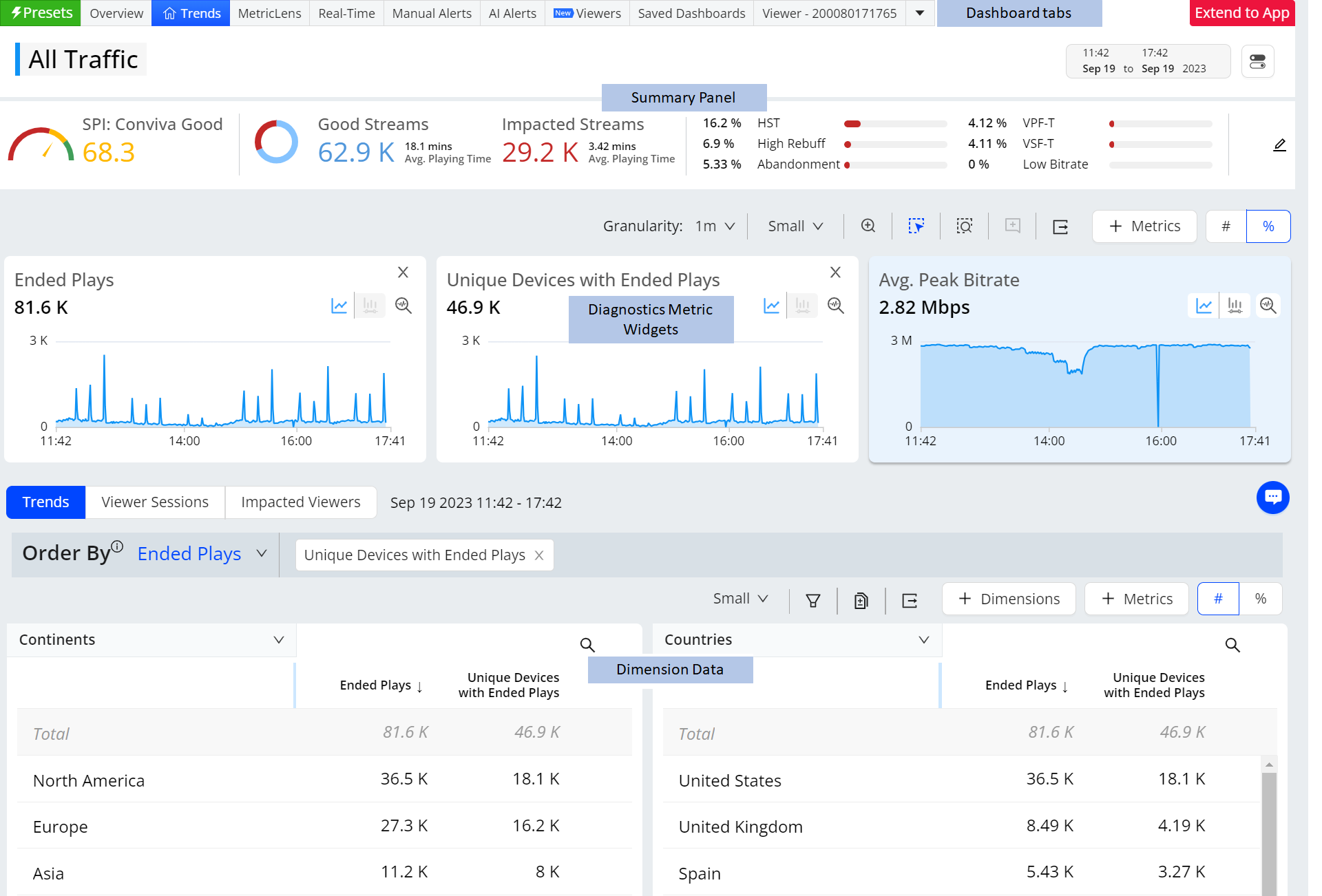 TechOps and others can easily perform issue resolutions and continuous improvements, monitoring overall operational performance metrics, drilling-down to discover impacted dimension entities, and analyzing impacted session timelines and viewer experiences. All these diagnostics and operational capabilities are available for historical and real-time data, across customizable levels of granularity (1 minute to 1 month).