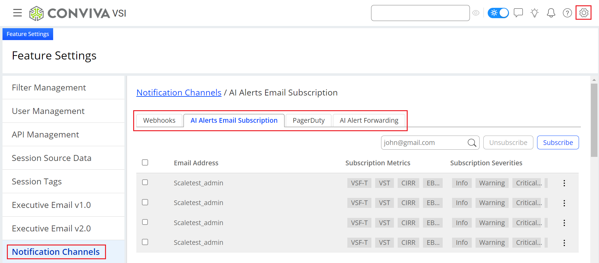 ConvivaVSI system settings involve administrative tasks such as, inviting and managing users, managing filter settings, setting up API access, selecting session tags as dimensions, configuring the business / technical metric logic, and notifications, including alerts and emails.