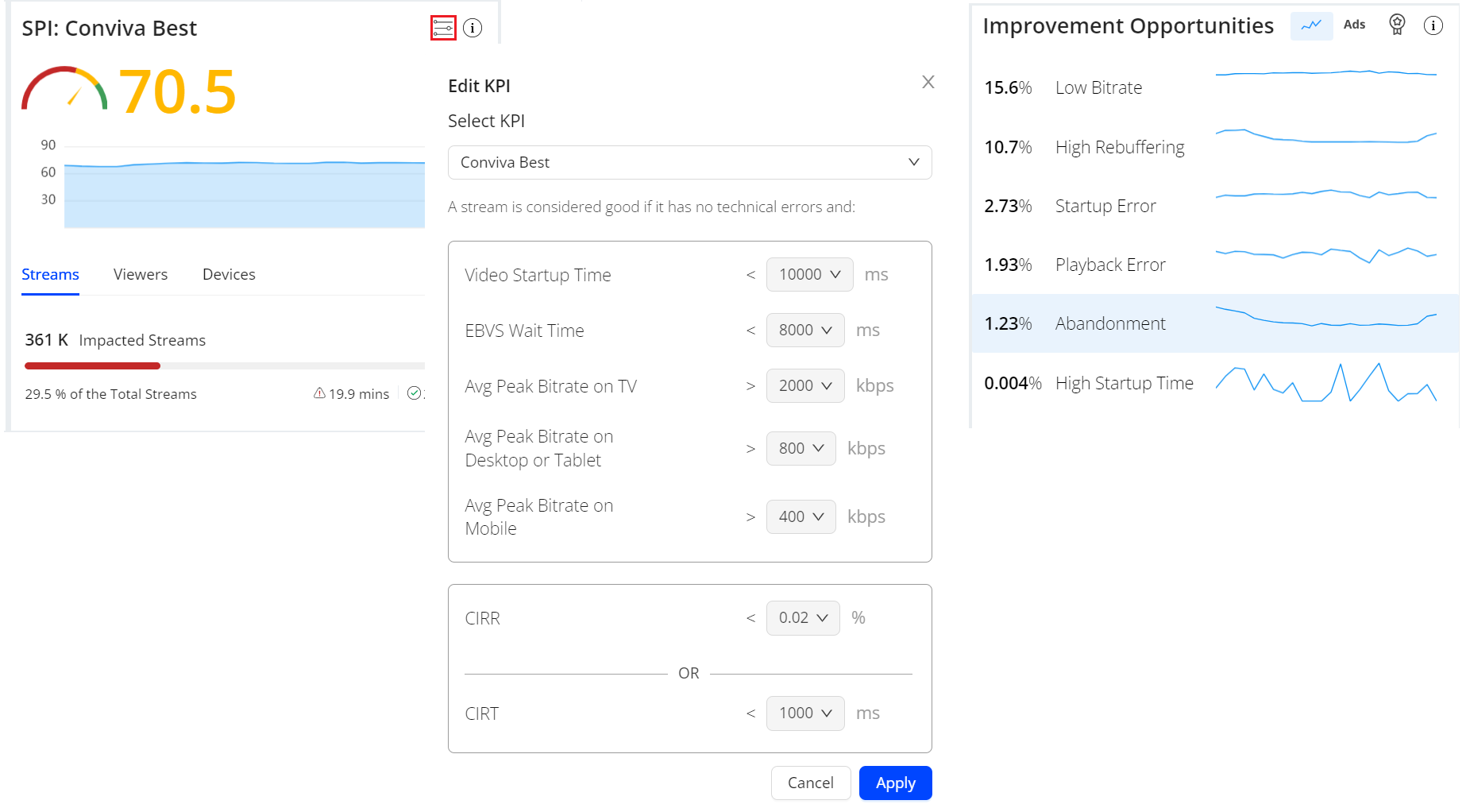 Use the SPI to visualize your performance KPIs and quickly identify under-performing dimensions related to issues impacting streaming quality. SPI allows you to assess the number and percentage of streams affected and then quickly drill-down to identify the root cause. Settings for KPI stream performance data are the in Overview page and shown as Improvement Opportunities and in Trends.