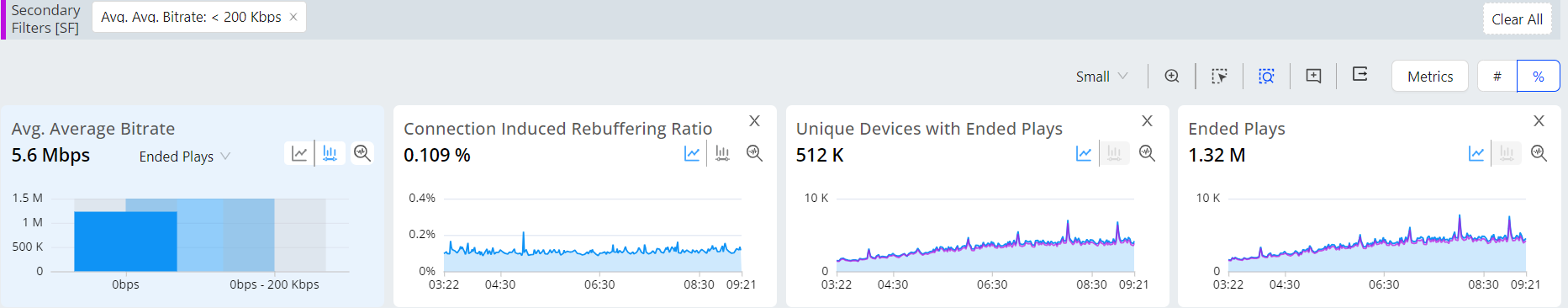 Additional secondary filters can be applied in Trends to further identify the root cause by a combination of metric settings, such as high bitrates and high rebuffering. When a secondary filter is applied, the Unique Devices companion metric also displays the devices impacted.