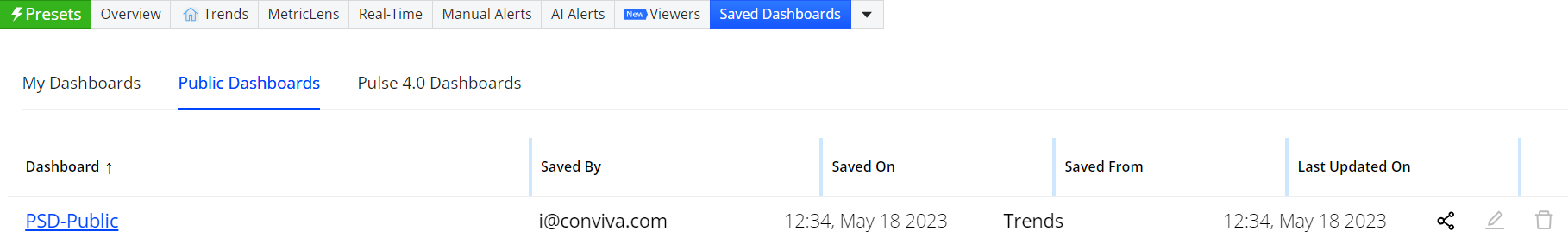 Note: Only shared Overview, MetricLens, and Viewers dashboards can be saved. Compare dashboards can be saved without sharing.