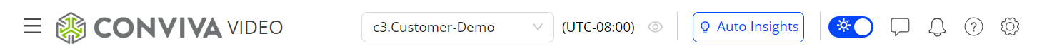 Your pulse.conviva.com account domain contains your c3.<customer_name> and appears in the Pulse menu bar for your application. Typically, each customer is allocated a single c3 account for exclusive access, in this example the c3.Customer-Demo account.
