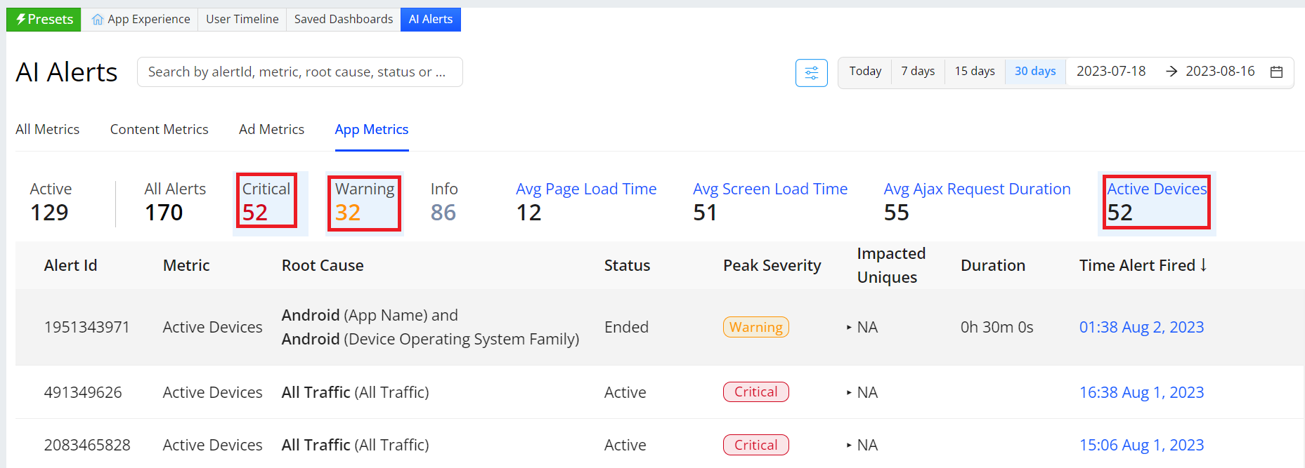 When a threshold is crossed, the impacted metric turns red. Click the metric value to open the Diagnostics page with data for the impacted dimension and filter settings.