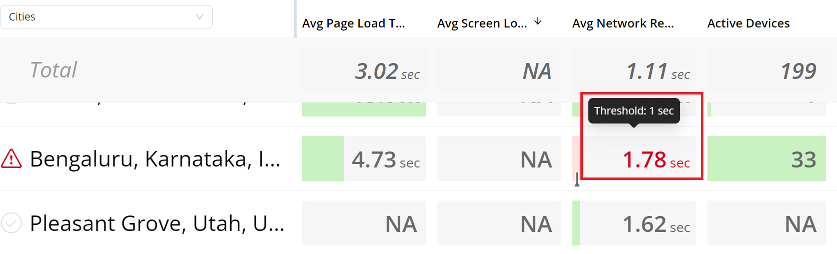 For example, apply an Avg Page Load Time secondary filter to focus on app page loads between 3 seconds and 20 seconds.