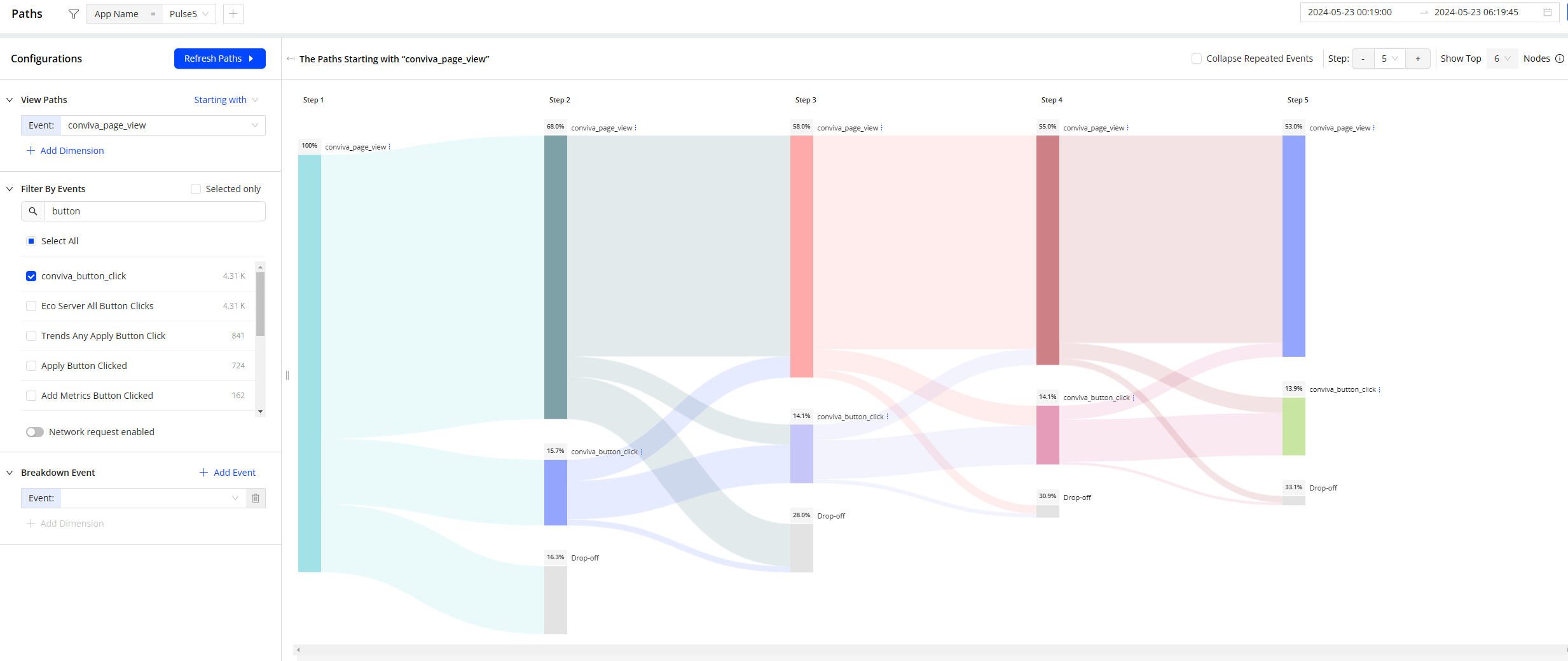 For example, create a Sankey chart that uses conviva_page_view, conviva_button_click, conviva_application_error, and conviva_link_click as nodes. The created Sankey chart allows you to understand the sequence of events and the composition of events, helping you gain insights for metric creation and potential issue identification.