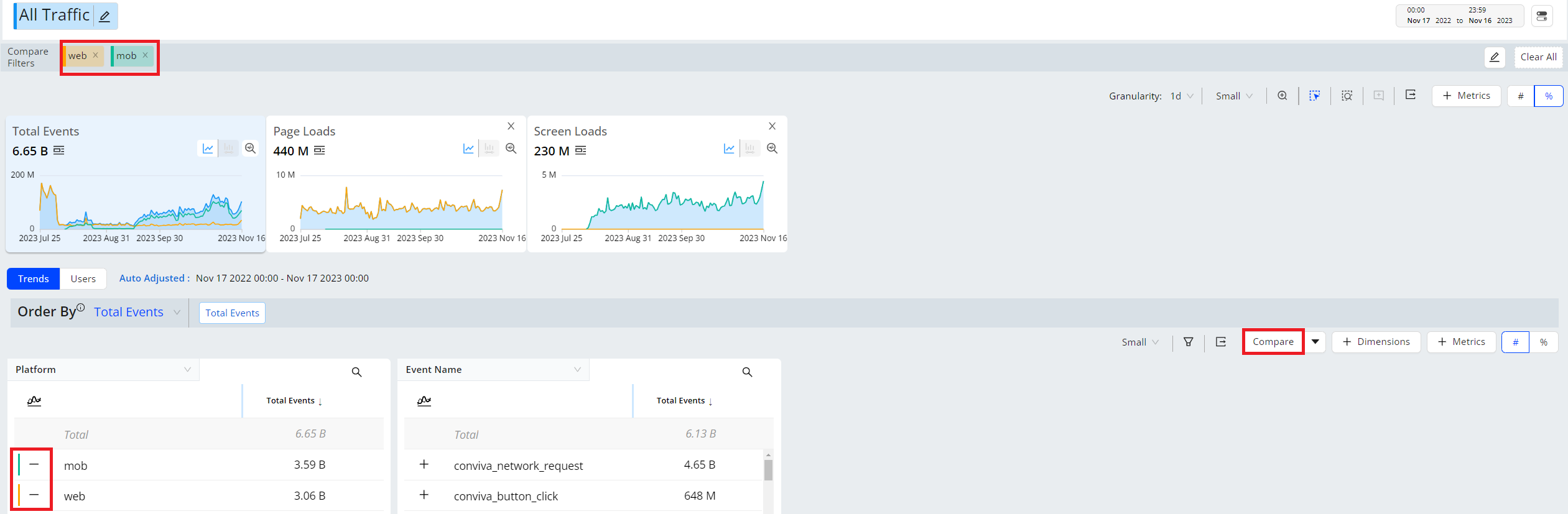 Trends offers comparison features in addition to the Compare dashboard. For example, use instant compare to quickly compare filters for the top five dimension entities or across a custom dimension filters.