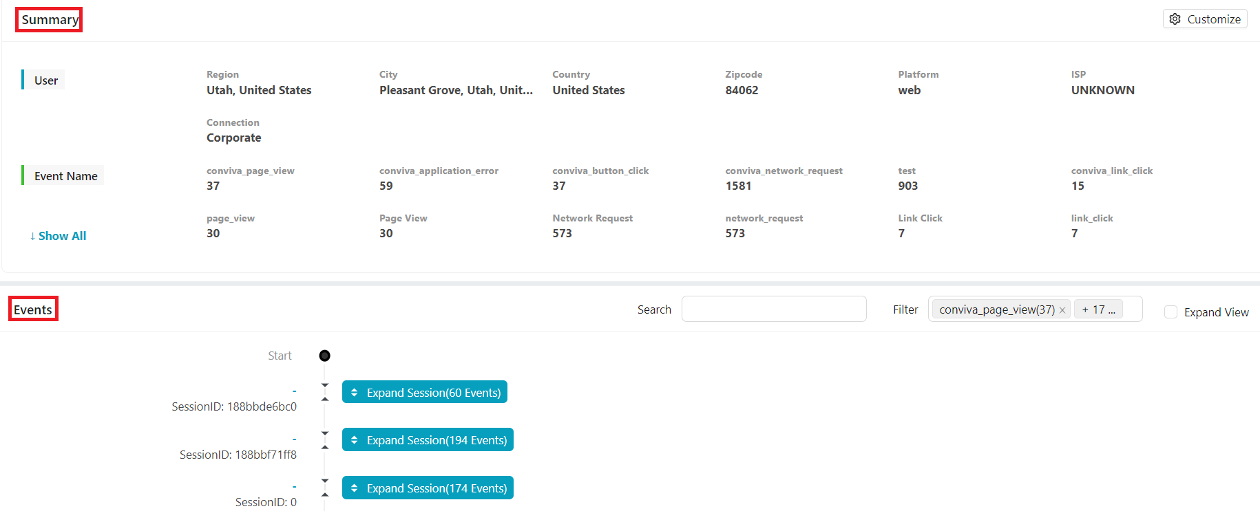 session summary, such as the related user information and session events count