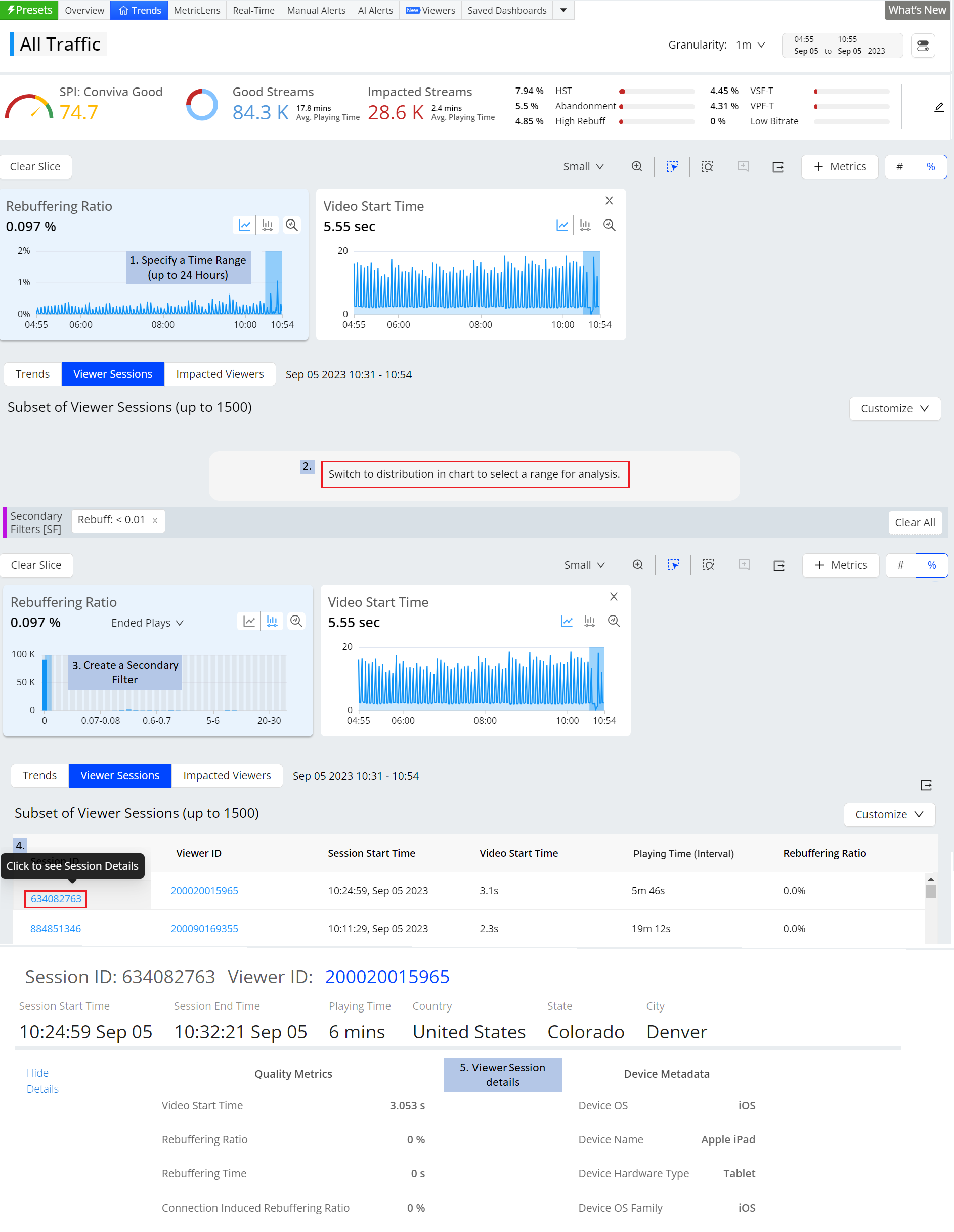 In addition, use the advanced features for detailed metric time series analysis and advanced drill-downs across sessions, impacted view, and impacted devices.