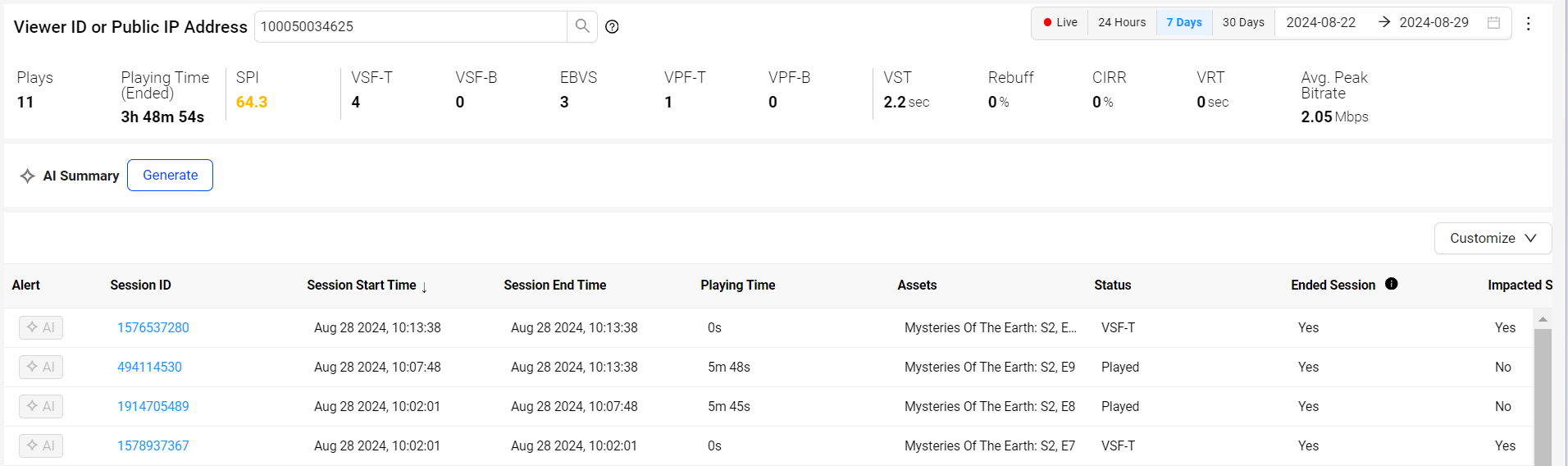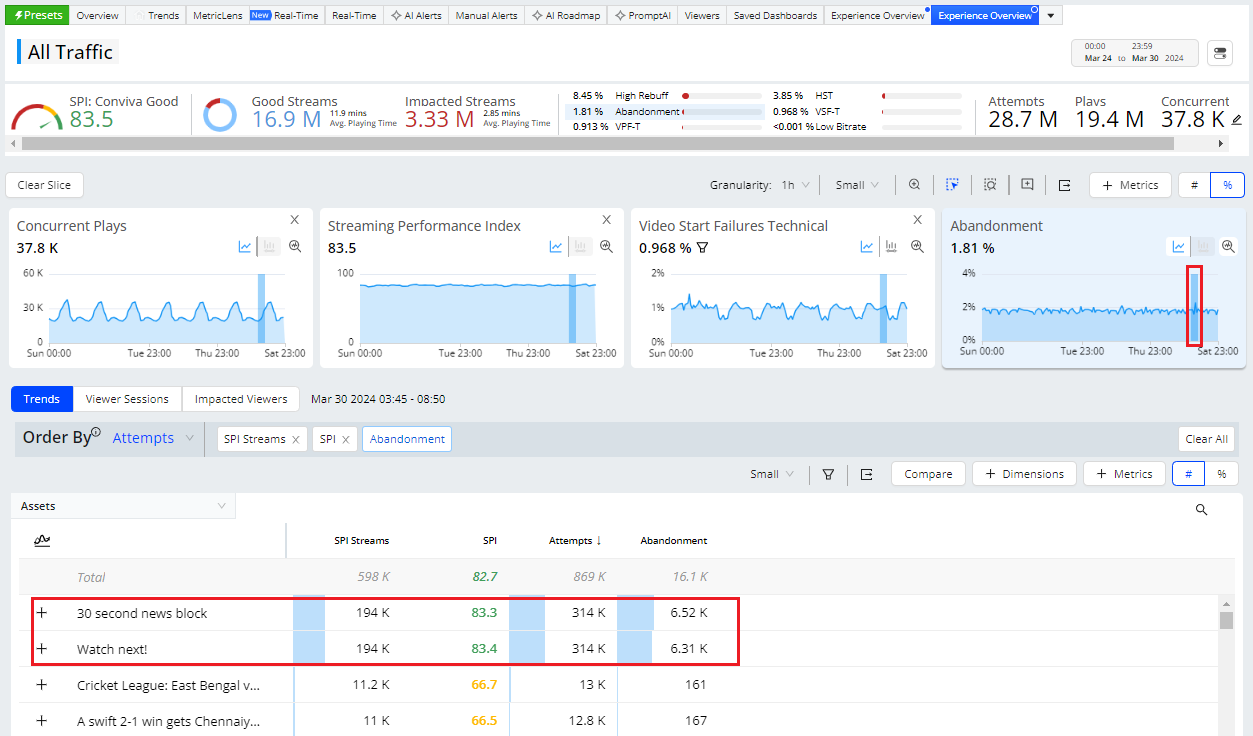 VSI provides a robust set of metrics to enable streaming performance monitoring and user behavior analysis across your streaming applications. Metric values appear as time series and distributions in metric widgets, and alongside dimensional values in the dimension drill-down tables.