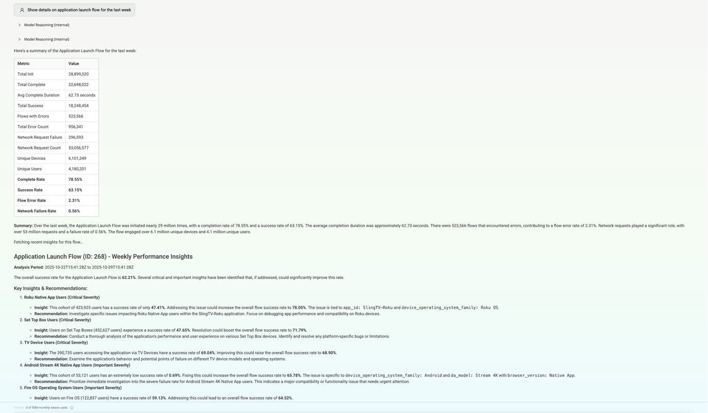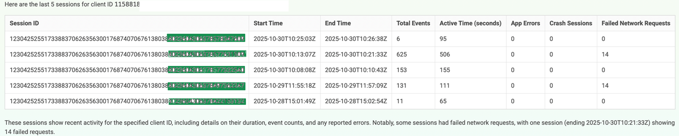 For example, “Show issues for user 12345” or “List the last five sessions for client xyz,” teams get immediate, context-rich insights without switching dashboards.