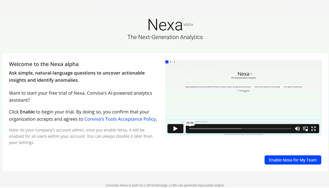 Note: For the Alpha release, Nexa supports queries and prompts related to Trends and Out-of-the-Box (OOB) Metrics.