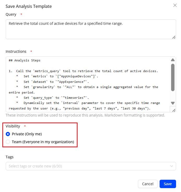 Team Analyses: comprise templates explicitly marked as Team. These templates are shared with the team, enabling consistent analysis approaches and knowledge reuse across collaborators.