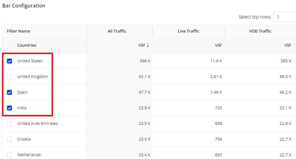 For example, if you want to check the VSF in three countries including United States, Spain, and India, ensure to select the related checkboxes. When the configuration is complete, the bar exclusively presents data for these three countries.